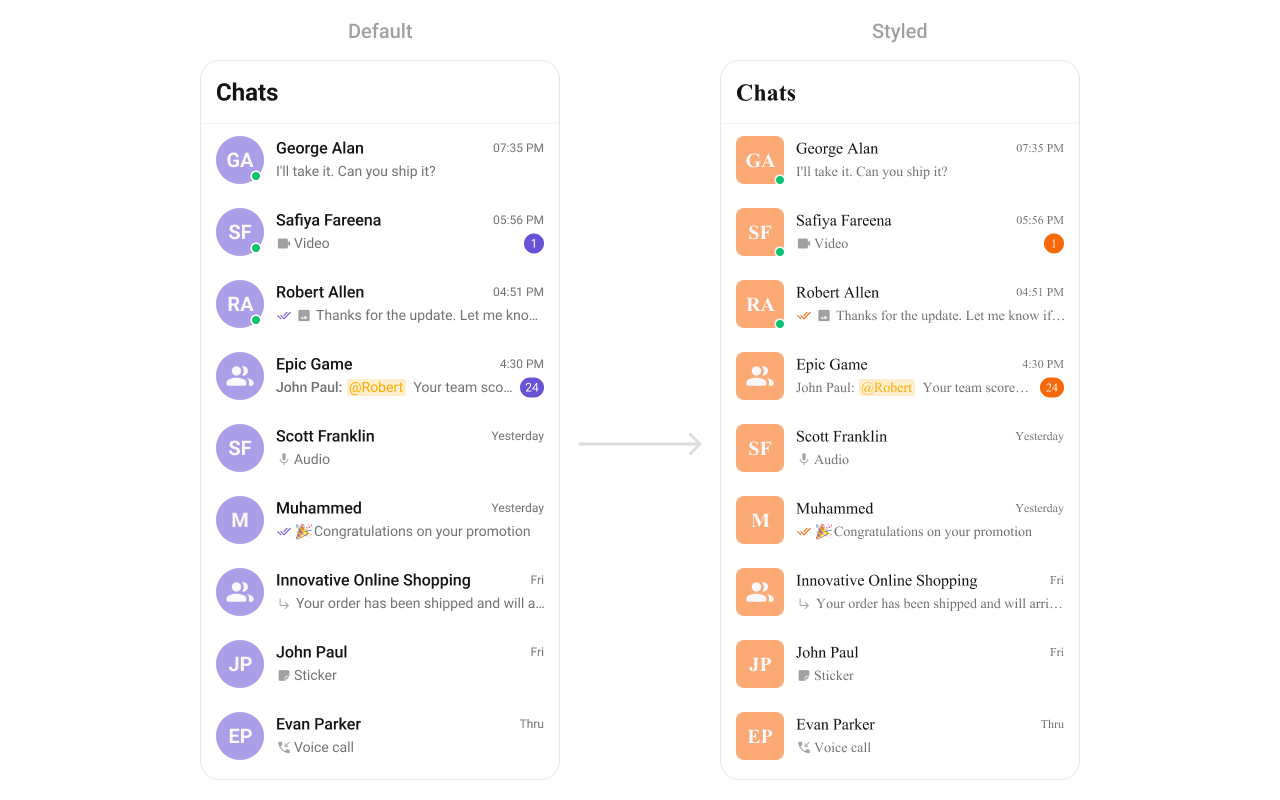 CometChat UIKit enables developers to seamlessly integrate customizable components into their applications. Each component is designed to ensure a consistent user experience while offering flexibility to adapt to your app’s design system. You can modify attributes such as colors, fonts, sizes, icons, and more using XML or programmatically. Below is a detailed guide for styling individual components within the UIKit.Components