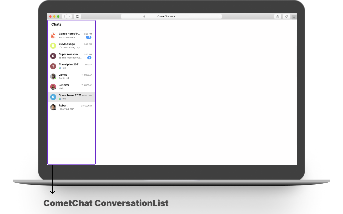 TheCometChatConversationListWithMessages is a component with a list of recent conversations. The component has all the necessary listeners and methods required to display the recent conversation list and shows the set of the messages/chats of the selected recent conversation